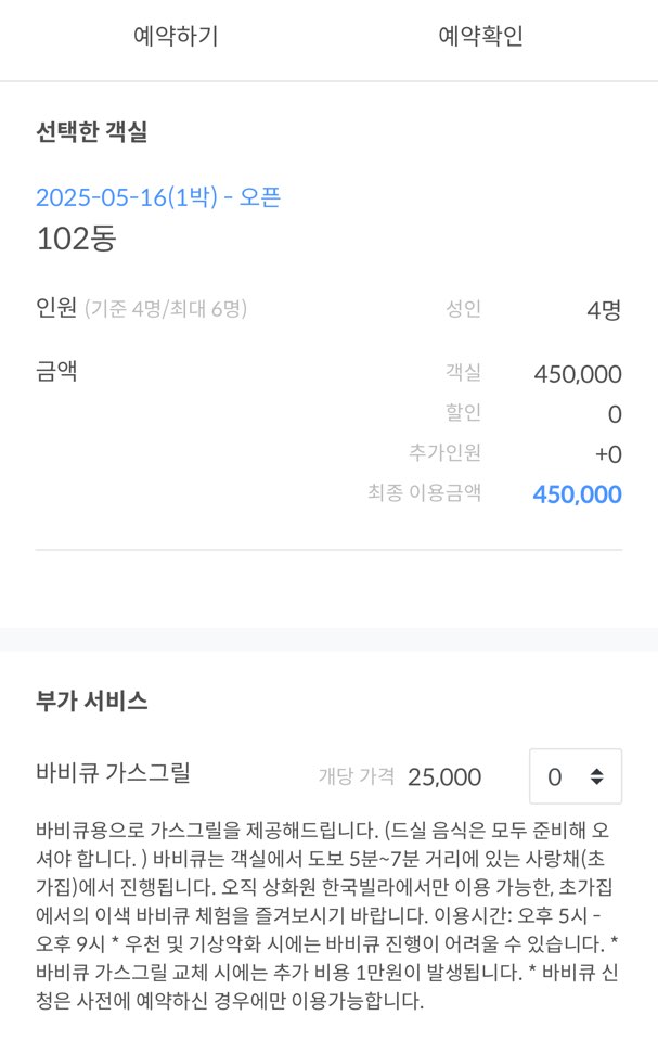 4. 인원과 결재 금액을 확인하신 다음 바비큐를 이용하시려면 부가서비스를 선택합니다.