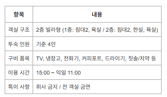 예약 가능 여부, 요금, 이용 가능 날짜는 사전에 반드시 문의 후 확인해 주세요.
